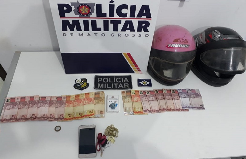 (Fotos: PM MT) – Na abordagem, os policiais ainda encontraram R$ 301,00 em dinheiro e um celular, cuja origem não souberam explicar, e correntes aparentando ser banhadas a ouro.