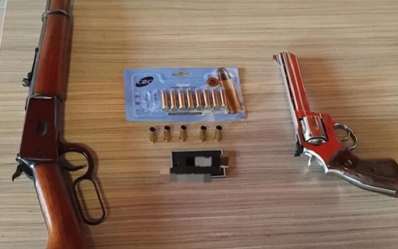 A mulher também informou que o suspeito havia danificado seu aparelho celular e efetuado disparos utilizando duas armas de fogo. Um revólver calibre .38 e uma carabina do mesmo calibre foram entregues aos policiais pela vítima, contudo o agressor não se encontrava na residência. Após rondas na região, o homem foi localizado em um bar e chegou a resistir a abordagem policial, porém foi detido com a necessidade do uso de algemas.”Após algumas tentativas de deter o homem, os militares precisaram algemá-lo devido a grande resistência do agressor”.