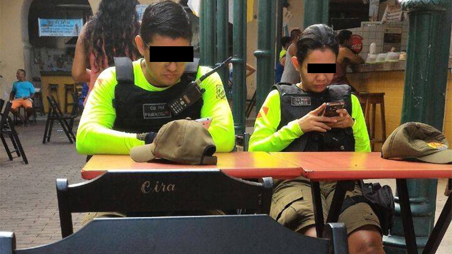 Os dois aparecem sentados e entretidos ao mexer no celular, com suas armas, pistolas .40, de uso exclusivo militar “dando sopa”.