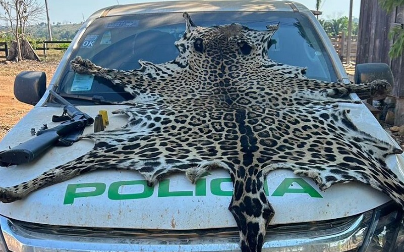 A arma e a pele de onça-pintada foram apreendidas e encaminhadas à delegacia de Polícia Civil.
