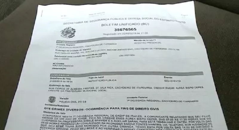 Boletim de ocorrência — (Foto: Reprodução/ TV Gazeta).