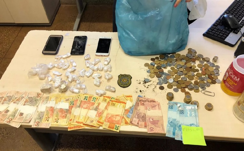 Foram encontradas 33 petecas de pasta base de cocaína, duas pedras de crack, R$1.547 mil, além de um recipiente plástico de solução de bateria.