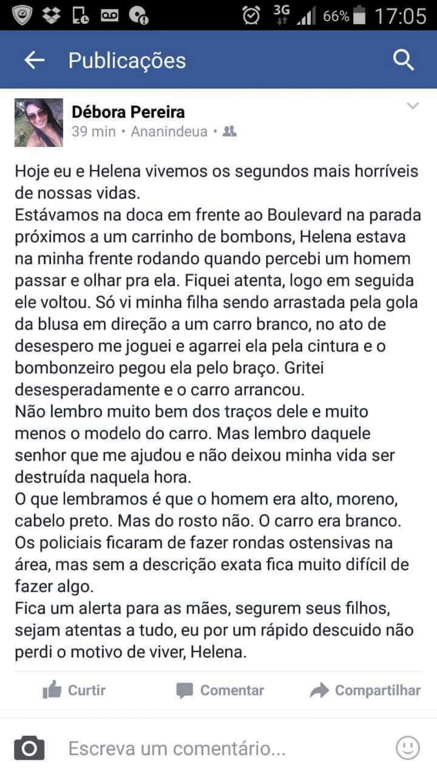 No relato de Débora, que não foi encontrada no Facebook pela reportagem do Portal ORM News, ela conta que estava em uma parada de ônibus na frente do shopping e que um homem alto, moreno e de cabelos pretos, tentou agarrar a filha dela, Helena, e levar para dentro de um carro branco. Ainda segundo o relato, a ação não foi concretizada porque ela teria agarrado a filha e teve a ajuda de um vendedor de bombons que estava na parada de ônibus. Na postagem a mulher pede ainda que os pais fiquem alertas em relação a segurança dos filhos.