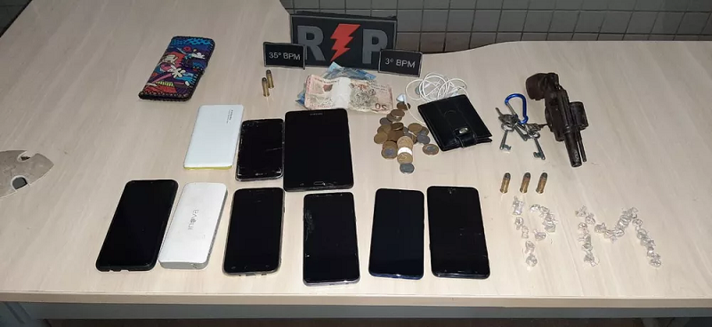 Os suspeitos estavam com um revólver calibre 38, drogas e vários celulares.