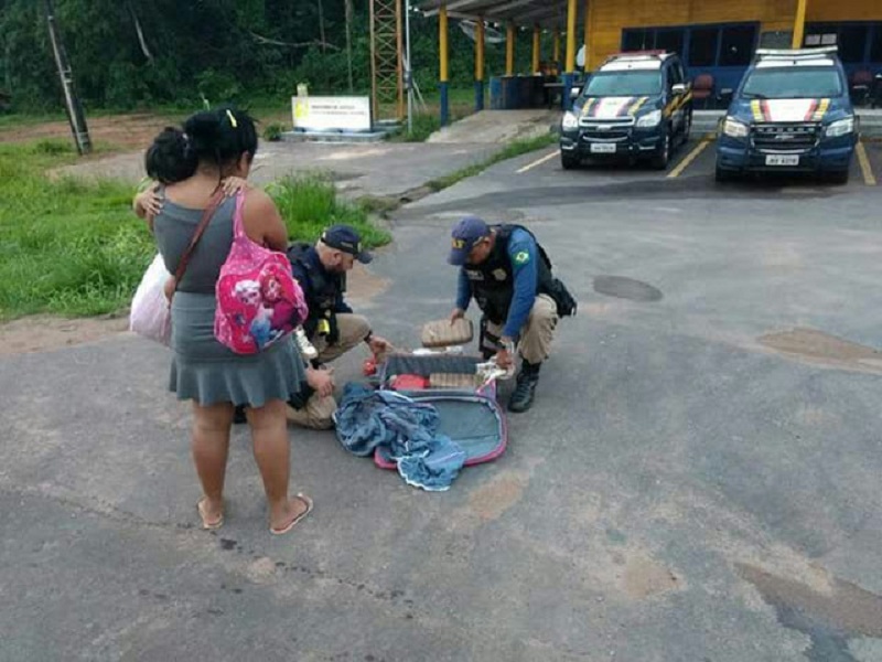 No dia 12/01/2018, por volta das 06h20m, na BR 163, KM 996, na cidade de Santarém/PA, a equipe da Polícia Rodoviária Federal apreendeu, no interior do ônibus de transporte intermunicipal de passageiros da empresa Ouro e Prata, Placa IUW-5537, 13 pacotes de substância entorpecente análoga a maconha, possivelmente do tipo “Skank”, totalizando aproximadamente 13,702 Kg, acondicionada em forma de barras e embaladas à vácuo. As substâncias ilícitas foram encontradas dentro de uma mala pertencente a senhora Brenda Ferreira Martins, a qual admitiu estar levando a mala com o ilícito. Segundo relato, a autora foi contratada por uma pessoa desconhecida para transportar a droga de Santarém até Marabá/PA, onde repassaria a uma outra pessoa também desconhecida, sendo que ganharia pelo transporte a importância de 6.000,00 (seis mil reais). Ainda, a autora encontrava-se com sua filha de 3 anos que foi encaminhada ao conselho tutelar para os procedimentos cabíveis. Diante dos fatos foi dado voz de prisão a referida autora e realizada a apreensão da droga, com consequente encaminhamento à Polícia Civil de Santarém/PA para os procedimentos de praxe. Não foi necessário o uso de algemas.