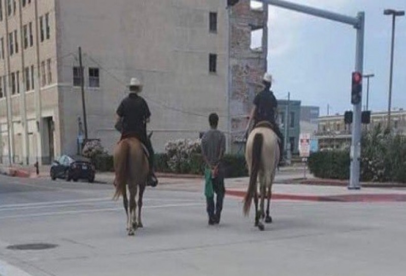 Uma foto tirada nas ruas de Galveston, no Texas, causou polêmica ao mostrar dois policiais brancos montados em cavalos e conduzindo um homem negro a pé, algemado e preso por uma corda até a delegacia. A imagem circula nas redes sociais desde o último sábado (3), quando Donald Neely, de 43 anos, foi preso por invasão de propriedade privada.
