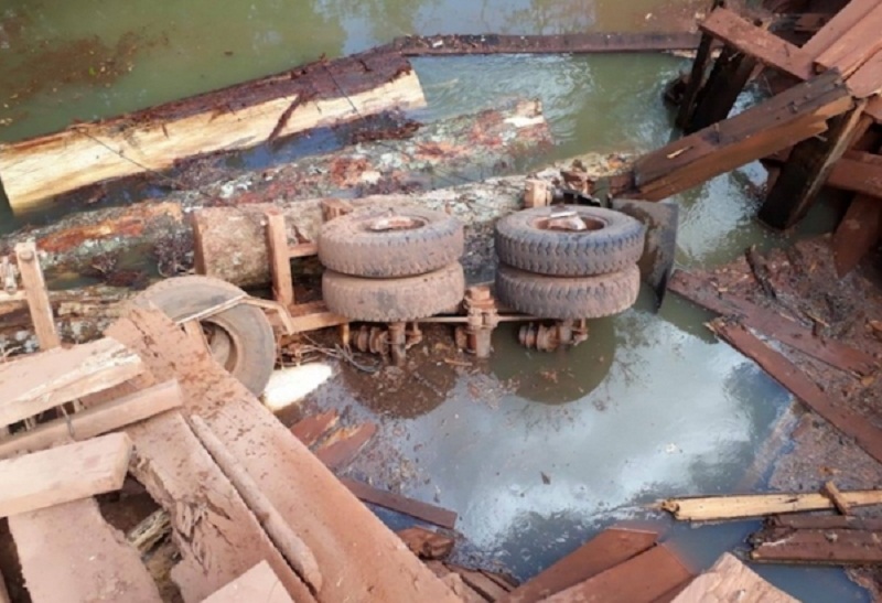 Ponte não suporta peso e vagão carregado com toras cai em rio em Alta Floresta(MT)