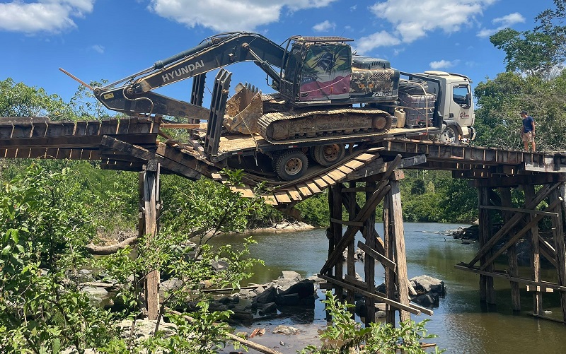 Ponte quebra e caminhão carregado com PC Escavadeira fica a deriva em Novo Progresso