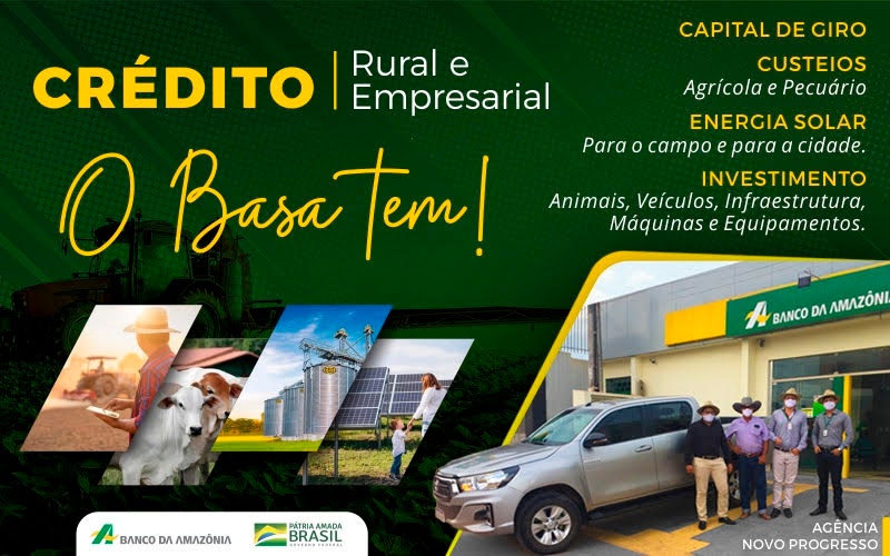 R$200.000.000,00 (duzentos milhões)! Este, é o volume minimo de recursos disponível para liberação em financiamentos pela agência do Banco Amazônia em Novo Progresso em 2022. Com taxas de juros posfixadas e prefixadas para empresas, e préfixadas produtores rurais (não PRONAF) a partir 5,44% ao ano e PRONAF a partir 0,50% ao ano.