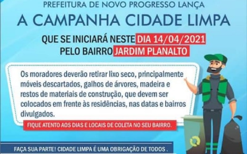 A Prefeitura Municipal de Novo Progresso através da Secretaria de Obras e Serviços Urbanos, anunciou que vai começar no próximo dia 14 de abril, o mutirão de limpeza no bairro Jardim Planalto. Na ação, equipes de limpeza estão realizando serviço de retirada de entulhos.