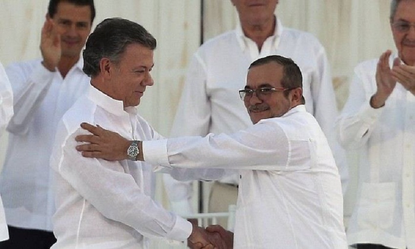 Presidente Juan Manuel Santos, à esquerda, e o líder das Farc, Rodrigo Londono, conhecido como Timochenko, se cumprimentam após assinarem acordo de paz no dia 26 de setembro – Fernando Vergara / APPresidente Juan Manuel Santos, à esquerda, e o líder das Farc, Rodrigo Londono, conhecido como Timochenko, se cumprimentam após assinarem acordo de paz no dia 26 de setembro – Fernando Vergara / AP
