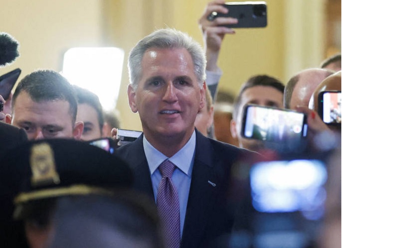 O presidente da Câmara dos EUA, o republicano Kevin McCarthy, volta ao seu escritório cercado pela imprensa no Capitólio, em Washington – (Foto: Jonathan Ernst/Reuters)