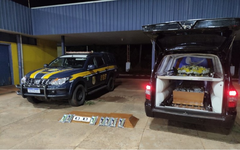 Foto:Reprodução | Em uma ocorrência inusitada, a Polícia Rodoviária Federal (PRF) apreendeu, na noite desta quinta-feira (29), em Terenos (MS), 162 Kg de cocaína que estavam escondidos dentro de um caixão funerário.