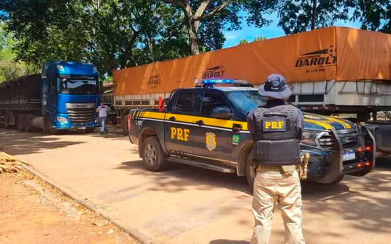 Por volta de 10h30, a equipe da PRF realizava fiscalização de veículos de carga e abordou duas carretas, uma SCANIA/R124 e a outra DAF/XF FTS530, transportando madeira da espécie Acapu, a qual tem extração protegida por lei e não possuía documento que comprovasse a sua legalidade.