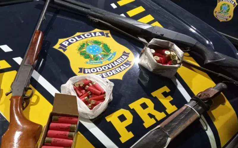 Armamentos, incluindo espingardas e pistolas, foram apreendidos por agentes da Polícia Rodoviária Federal.