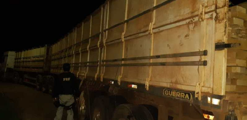 O primeiro flagrante ocorreu por volta de 1h15 da madrugada, quando os policiais abordaram um caminhão que transportava madeira serrada. Durante a checagem da carga e dos documentos foi constatado que a guia florestal era falsa. Além disso, foram encontrados 50,28 m³ das espécies “muiracatiara” e “maçaranduba” na carroceria do veículo. Ao ser interrogado, o condutor admitiu ter usado drogas durante o percurso, entregando à PRF seis cartelas com quase 70 comprimidos de Nobésio extra forte, mais conhecido como rebite.