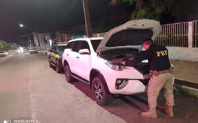 (Foto:Reprodução) – Na noite de terça-feira (03), a Polícia Rodoviária Federal (PRF) em deslocamento avistou um veículo do modelo Toyota Hilux SW4, de cor Branca QYQ-6C90 com alguns elementos que divergiam dos padrões de fábrica.
