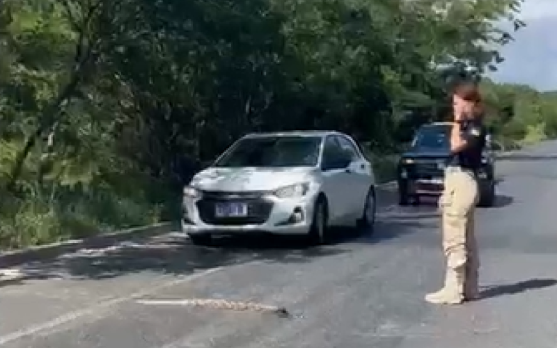 A equipe da PRF estava encerrando o turno de serviço quando percebeu a presença do animal na pista. Diante do risco de atropelamento, os agentes decidiram sinalizar a via e paralisar o trânsito por alguns minutos até que a serpente alcançasse o outro lado da rodovia.