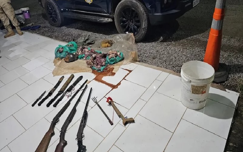 Os animais abatidos eram três pacas, uma capivara e um quelônio. As armas não possuíam numeração, eram duas espingardas de alma lisa e calibre 28 e uma espingarda de alma lisa e calibre 20.