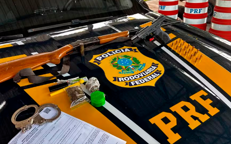 A Polícia Rodoviária Federal (PRF) registrou no mesmo dia, local e horário casos de tráfico de drogas, porte ilegal de arma de fogo e uso de documento falso, além de dar cumprimento a um mandado de prisão. A abordagem aconteceu no KM 995 da BR-163 em Santarém, no oeste do Pará.