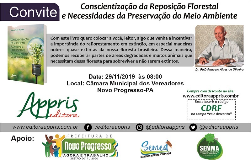 Professor que marcou a sua trajetória no magistério, em escola pública de Novo Progresso convida a todos para o lançamento dos livros “Concientização da Reposição Florestal e a necessidade da Preservação do Meio Ambiente” e estratégias Psicopedagógicas para Diminuição das Dificuldades de Aprendizagem na Leitura escrita e Preservação do Meio Ambiente” que terá solenidade na Câmara Municipal no Próximo dia 29 de Novembro de 2019 as 08 horas em Novo Progresso.
