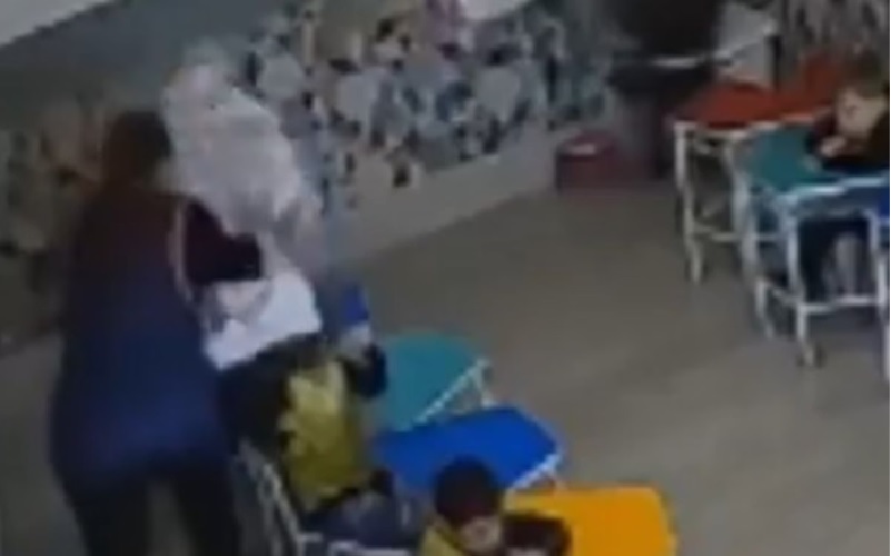 As câmeras de segurança da escola mostram o exato momento que a professora grita com o menino e, na sequência, joga uma pilha de livros contra o menino. O barulho da pancada pode ser ouvido nas imagens. Ao perceber o machucado, a mulher tentar limpar o rosto ferido da criança e o leva até o banheiro para lavar a boca.