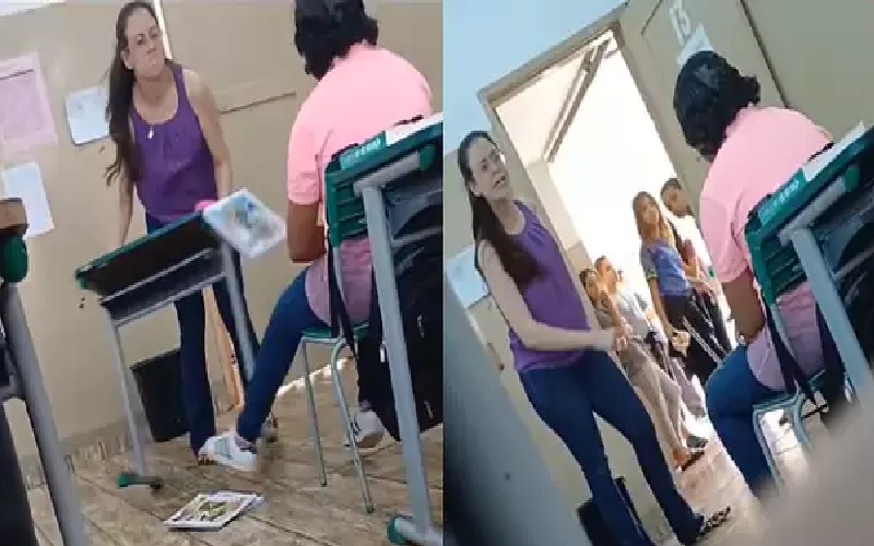Nesse momento, a docente se irrita e arrasta com força a mesa da adolescente, deixando o seu caderno cair. Em seguida, ela começa a gritar com a menina, abre a porta da sala e profere palavras de ordem, mandando-a para a direção da escola.