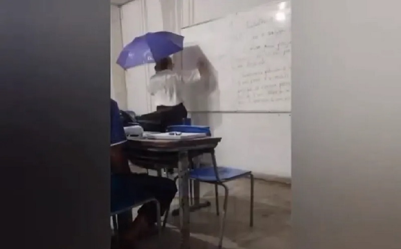 Professora usa guarda-chuva em sala de aula para se proteger da chuva no Pará