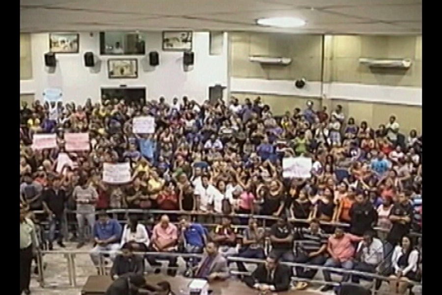 Professores fazem protesto na Câmara Municipal de Marabá, sudeste do Pará, durante sessão que aprovou a retirada do plano de cargos e salários, além do fim adicional de tempo de serviço da categoria. A votação gerou confusão no plenário e a Polícia Militar foi acionada para intervir. Sessão ocorreu na tarde de terça-feira (23).