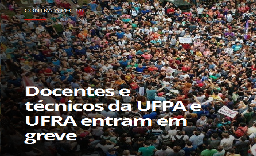 Professores e técnicos da Universidade Federal do Pará (UFPA) e Universidade Federal Rural da Amazônia (UFRA) entram em greve por tempo indeterminado a partir desta segunda-feira (14), em Belém. Trata-se de uma manifestação de apoio à ocupação das instituições contra a Proposta de Emenda Constitucional (PEC) 55, que limita gastos públicos por 20 anos.
