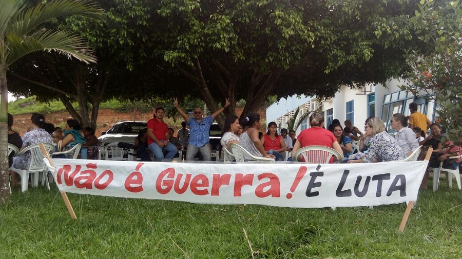 Professores acamparam em frente a Prefeitura com uma faixa “Não é Guerra! é Luta “.