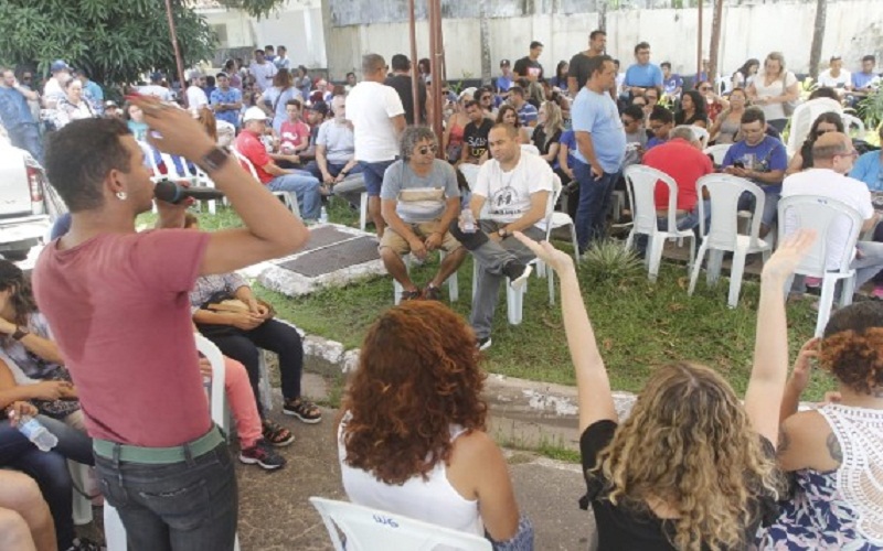 Os professores da rede pública estadual, em greve desde o dia 02 de maio, realizam agora de manhã um protesto em frente ao Palácio de Despachos do Governo do Estado, na Av. Dr. Freitas, próximo a Almirante Barroso.