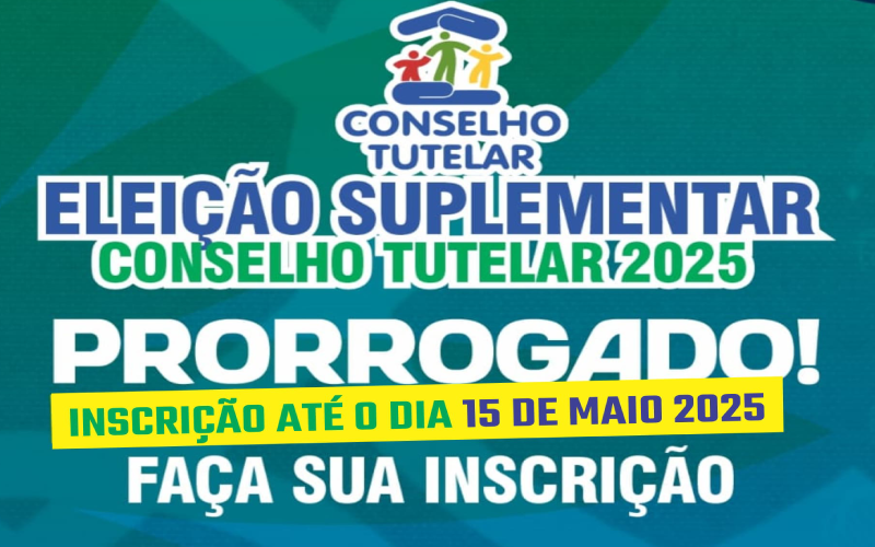 Prorrogado prazo para inscrições de Conselheiro Tutelar suplente, Eleição suplementar, inscrições de 01 a 23 de abril 2025 passa valer até dia 19 de maio de 2025 na recepção do CREAS das 08h00 às 12h00.