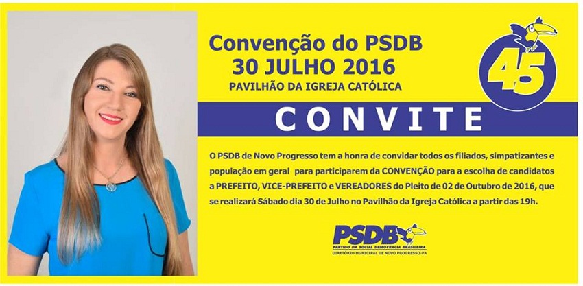 A primeira convenção partidária de Novo Progresso vai ser realizada no dia 30 de Julho pelo Partido Social Democrático Brasileiro, (PSDB), no Pavilhão da Igreja Católica.