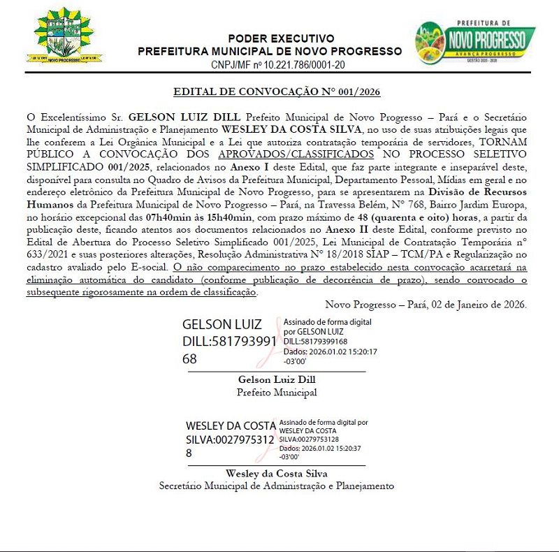 Publicação Nº 001/2026 – EDITAL DE CONVOCAÇÃO PREFEITURA MUNICIPAL DE NOVO PROGRESSO