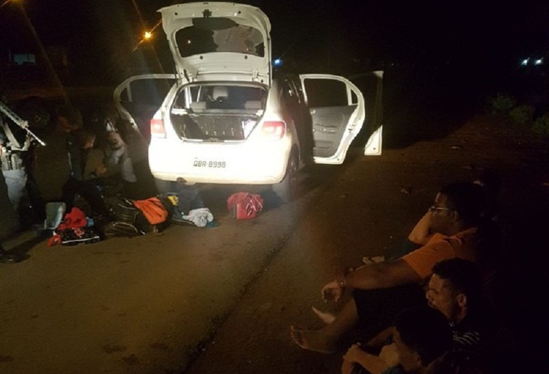 Assaltantes foram presos durante a fuga em carro (Foto: Polícia Militar/Divulgação) – Assaltantes foram abordados na BR-163 em Rosário Oeste, durante a fuga. Com eles foram apreendidos equipamentos usados na ação criminosa.