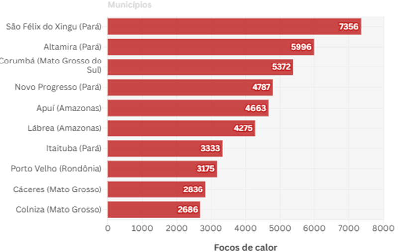 No coração da Amazônia paraense, São Félix do Xingu se tornou o epicentro das queimadas no Brasil em 2024. Com 7.356 focos de calor, o município liderou o ranking das dez cidades com mais registros de fogo no programa BD QUEIMADAS, do Instituto Nacional de Pesquisas Espaciais (Inpe).