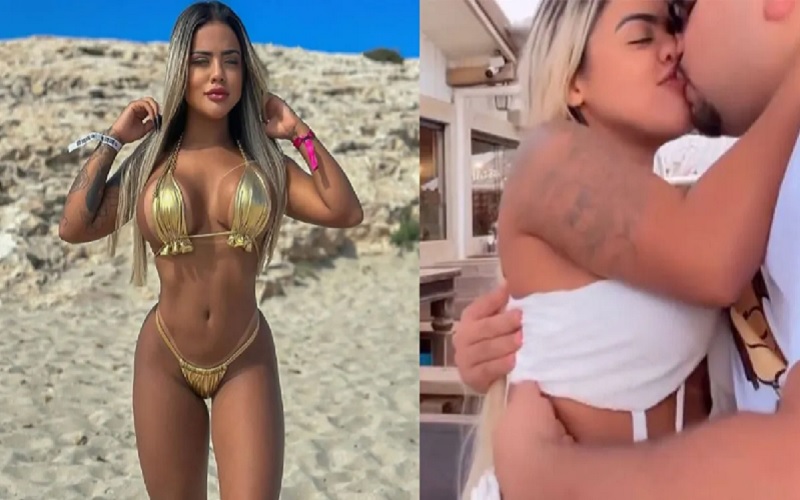 A influenciadora Lays Peace, viralizou nas redes sociais estão perplexos nas redes sociais após publicar um vídeo ao lado do namorado dando um beijão de língua enquanto o rapaz também dá “socos” na costela da loira. (Foto:Reprodução).