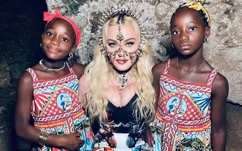 Madonna com as filhas gêmeas Estere e Stella, de 11 anos, adotadas no Malawi — Foto: Reprodução/Instagram