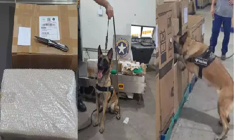 Um vídeo encaminhado a reportagem mostra o momento em que a equipe de cão de faro da Receita Federal acha a droga. Na filmagem que tem mais de 10 segundos, um pastor-alemão aparece farejando as caixas de encomendas. Num dos pacotes, o animal indica que tem algo errado e é recompensado em seguida.