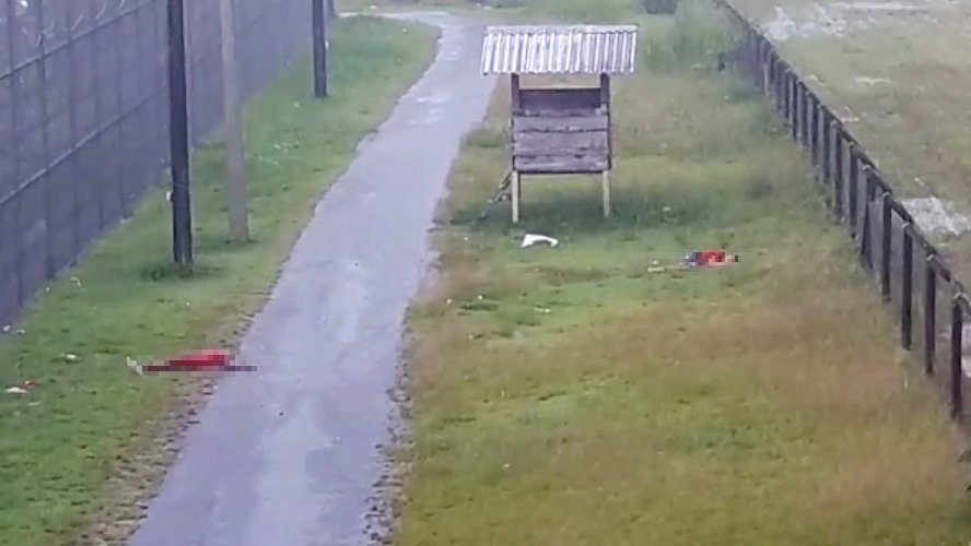 Um vídeo, registrado no interior do presídio, mostra vários corpos caídos na área externa.