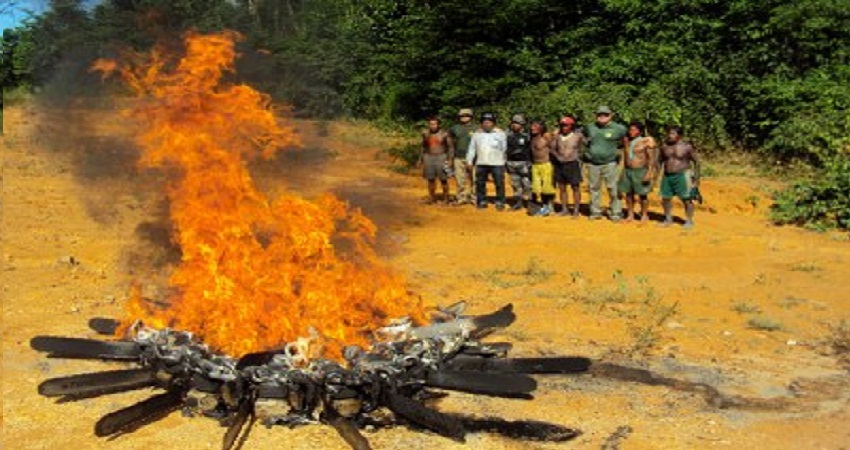 Indígenas e fiscais do Ibama queimam motosserras apreendidas na operação Kayapó, em 2014, que deu origem à operação Rios Voadores (foto: Ibama).