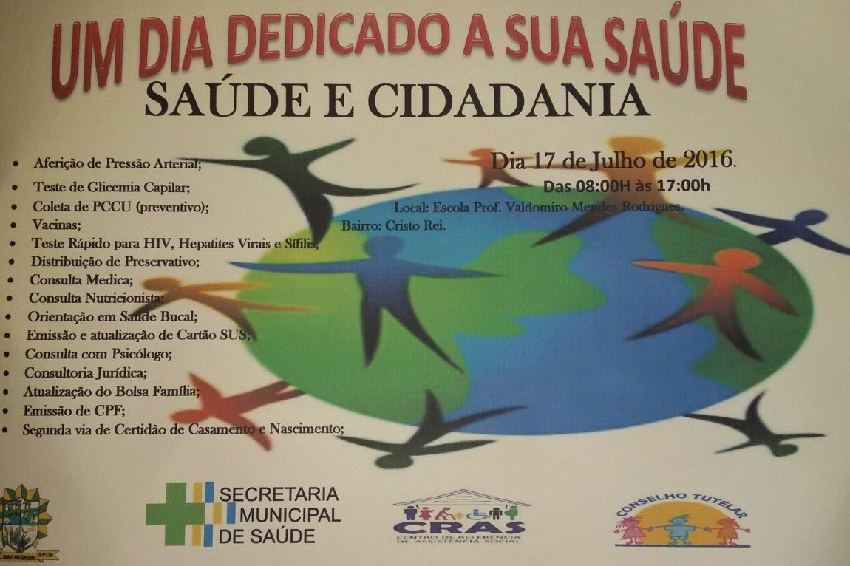 A Secretaria Municipal de Saúde, Ação Social e Conselho Tutelar promove neste domingo, 17, a partir das 8h, até as 17h a primeira edição da Ação de Saúde e Cidadania na escola Waldomiro Mendes Rodrigues.