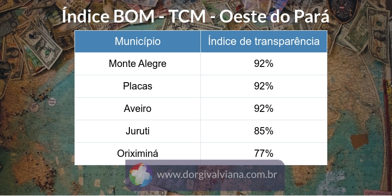 No Oeste do Pará, alcançaram bom índice de transparência nos gastos os Municípios de Monte Alegre, Juruti, Placas, Aveiro e Oriximiná, com os índices destacados na imagem: