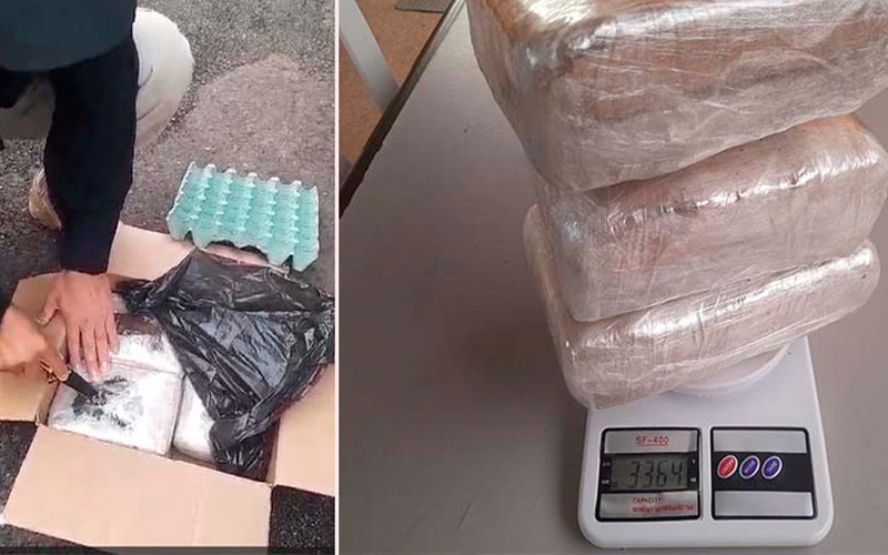 Ao seguir com as verificações, foi aberta a caixa e constatado a existência de 3 pacotes de substâncias ilícitas. Aproximadamente 3.364 g de substância análoga à maconha.