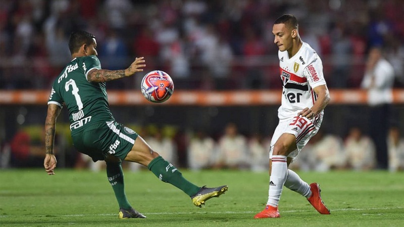 O Jogo – O primeiro tempo foi bastante agitado no Morumbi. Empurrado por mais de 40 mil pessoas, o São Paulo começou melhor e levava perigo com o ousado Antony, causador de problemas à defesa palmeirense. Aos 14 minutos, após triangulação do jovem com Igor Gomes e Pablo, Everton Felipe aproveitou a sobra e bateu colocado da entrada da área, tirando tinta do travessão.