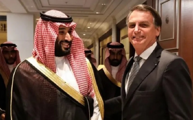 Bolsonaro e o príncipe herdeiro da Arábia Saudita, Mohammad bin Salman, durante viagem do então presidente brasileiro ao país árabe, em 2019 — Foto: JOSÉ DIAS/PR