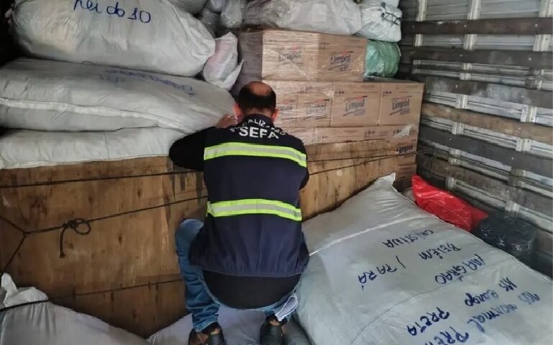 Fiscais de receitas estaduais da Secretaria de Estado da Fazenda (Sefa) apreenderam, na segunda-feira (23), 115 fardos de confecções, avaliados em R$ 411.000,00, que eram transportados sem nota fiscal, escondidos em meio a carga de produtos de limpeza. Os servidores são lotados na Coordenação de Controle de Mercadorias em Trânsito do Gurupi, em Cachoeira do Piriá, nordeste do Estado.