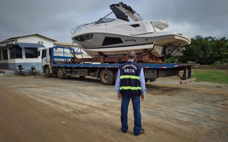 Durante fiscalização realizada na Unidade Especializada de Controle de Mercadorias em Trânsito (UECMT) de São Geraldo do Araguaia, agentes abordaram um caminhão que transportava uma lancha proveniente de Capitólio (MG), com destino declarado ao Estado do Amapá. A equipe verificou que o veículo levava uma embarcação modelo V300, avaliada em R$ 521.701,82, conforme informações apresentadas na nota fiscal do transporte.