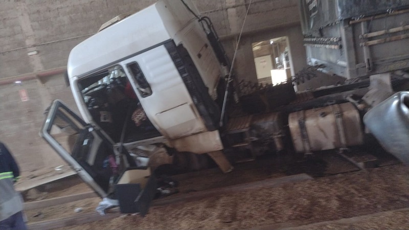 De acordo com informações, a carreta, MAN TGX, Bitrem (9 eixos), realizava o descarregamento de soja na empresa, quando um dos pistão hidráulicos do tombador estourou, fazendo com que a carreta descesse repentinamente.
